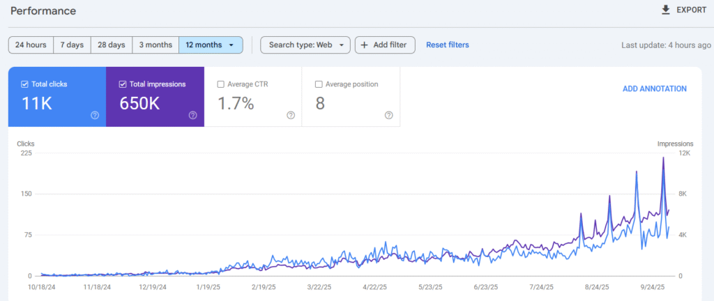 Throughout the months of working on the site, I also schedule viral traffic campaigns to periodically boost rankings for various pages across the site. This helps speed up the ranking process and amplify all of other things that have been done. To learn more about how this works, check out my viral traffic page.